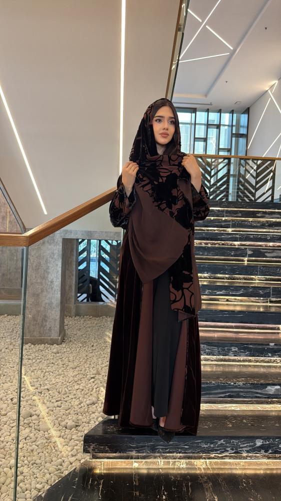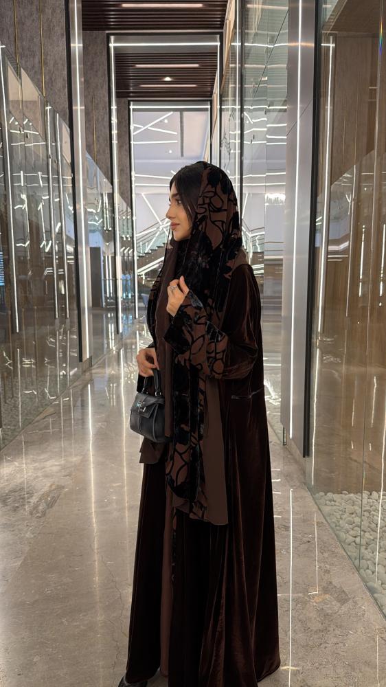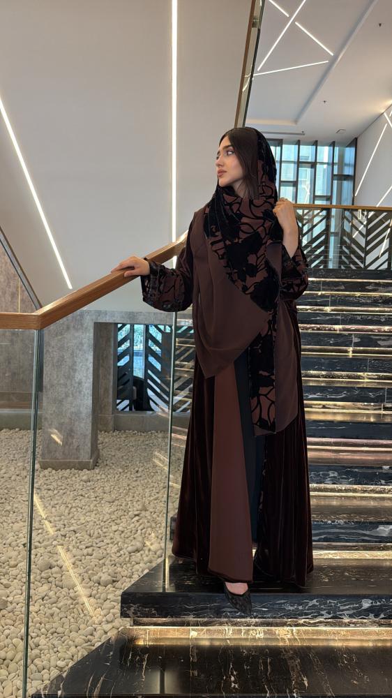 القماش / مخمل بني + الاكمام مخمل شيفون