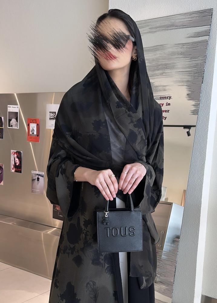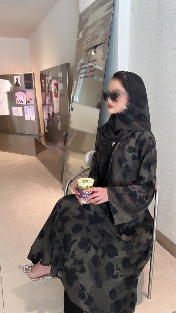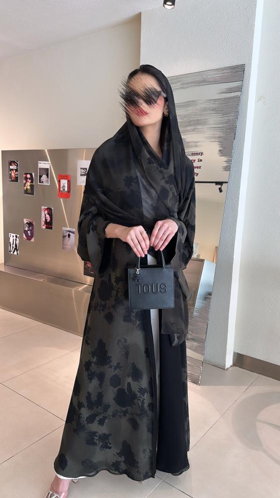 القماش / شيفون زيتي مشجر + بوال اسود (دبل فيس)