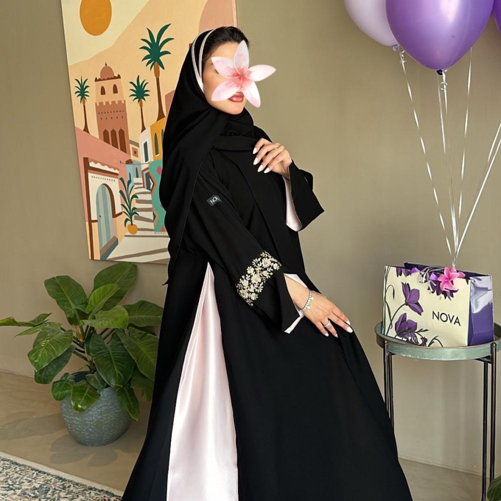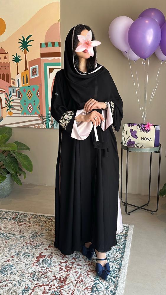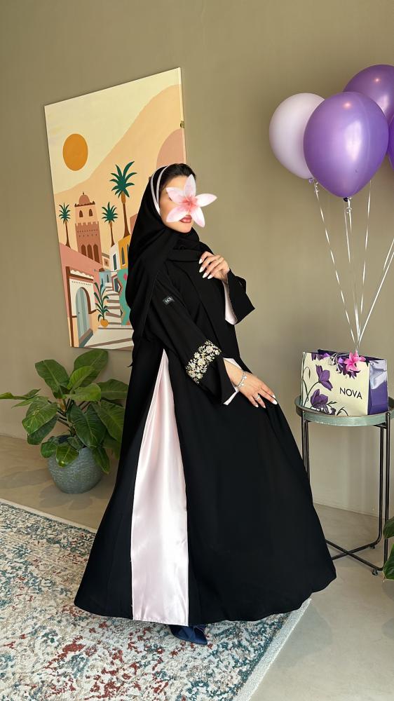 القماش / كريب ملكي اسود + الجنبين تفته وردي صيفي + الاكمام زيج مطرز
