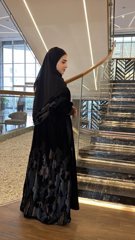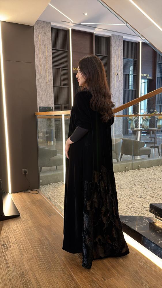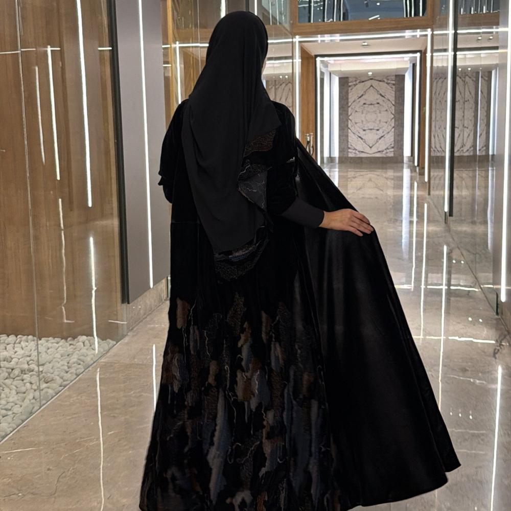 القماش / مخمل اسود ساده + من الخلف مخمل اسود بتطريز حاشية + الاكمام سترتش اسود